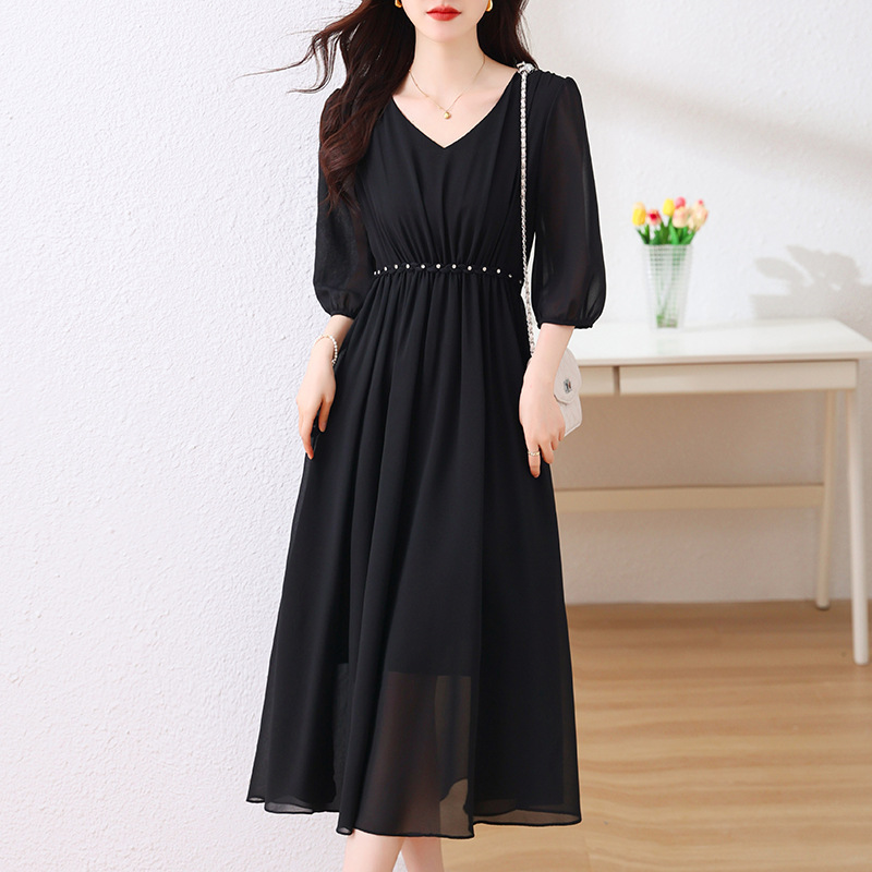 Real shot gaun panjang menengah sifon Ukuran plus gaun hitam kecil gaya Hepburn fan dewi elegan baru musim panas wanita