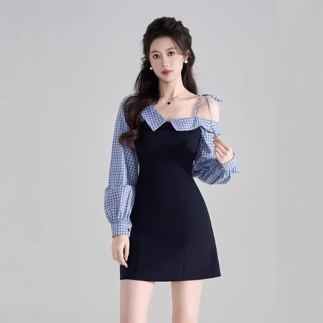 Kemeja Kotak-kotak Jahitan Bergaya Premium Model Sama dengan Selebriti Internet Model Baru Musim Semi dan Musim Panas Rok Terusan Bahu Terbuka Pakaian Wanita Ramping Ukuran Besar