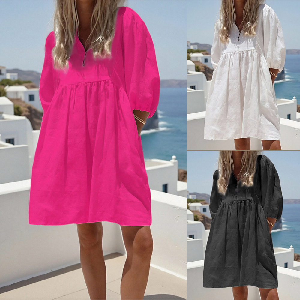 FD1313 tersedia 2023 gaun katun dan linen wanita lengan puff leher V longgar mode wanita lintas batas baru musim panas