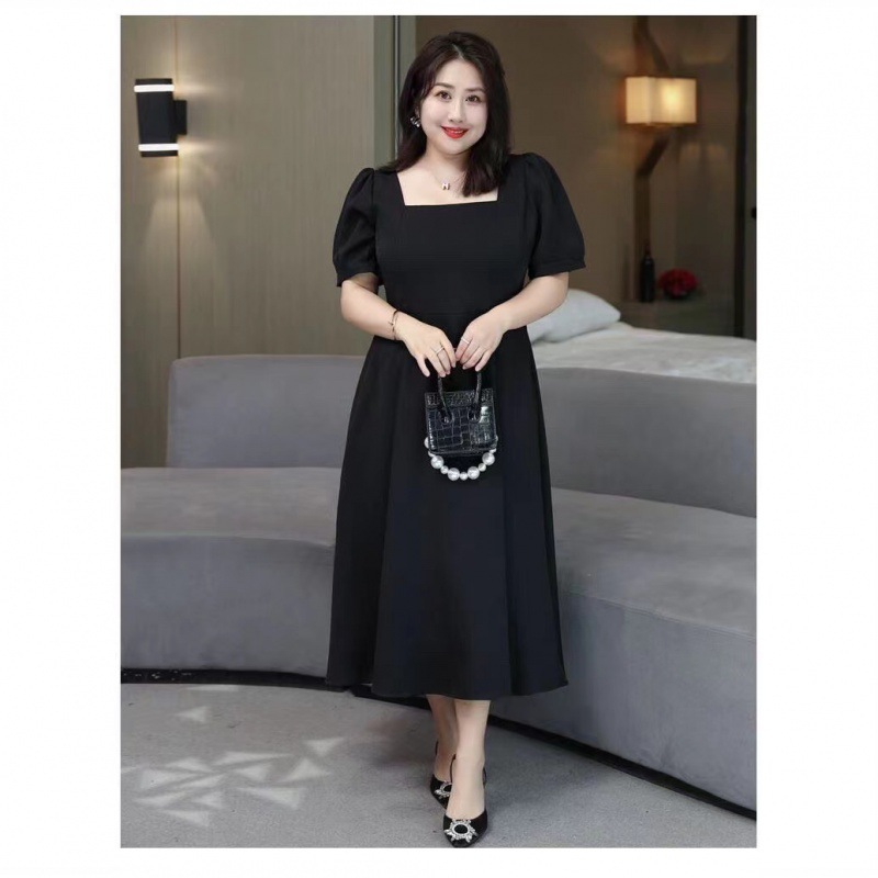 Gaun ukuran besar anak perempuan gemuk, gaun hitam kerah persegi manis, pinggang renda musim gugur pelangsing Lolita