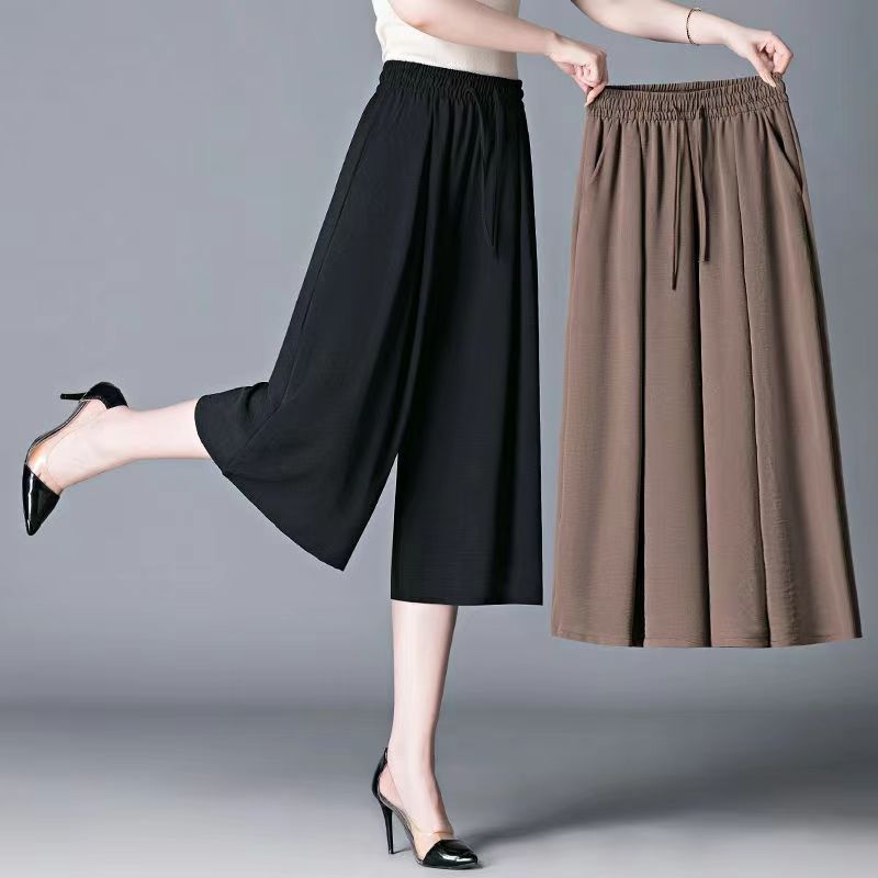 Celana Rok Sutra Es Celana 7/8 Model Tipis Musim Panas Celana Kaki Lebar Terlihat Kurus Longgar Celana Ibu Elastis Ukuran Besar Pinggang Tinggi