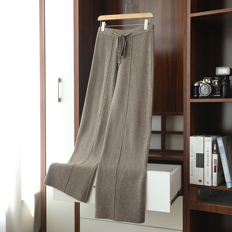 Celana wol tebal untuk wanita, celana jahitan setengah kaki lebar lurus kasual longgar pinggang tinggi musim gugur dan musim dingin model elegan