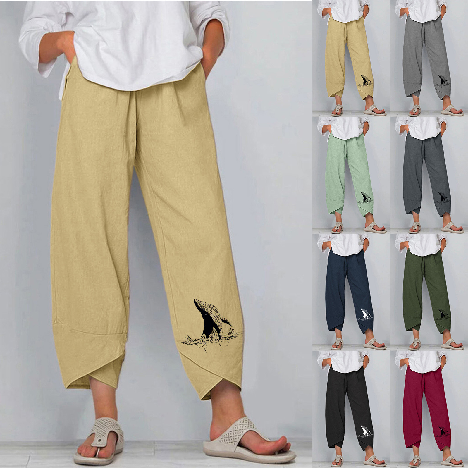 Celana wanita crop kasual longgar pinggang tinggi Amazon celana kaki lebar bercetak katun dan linen baru musim semi dan panas 2023