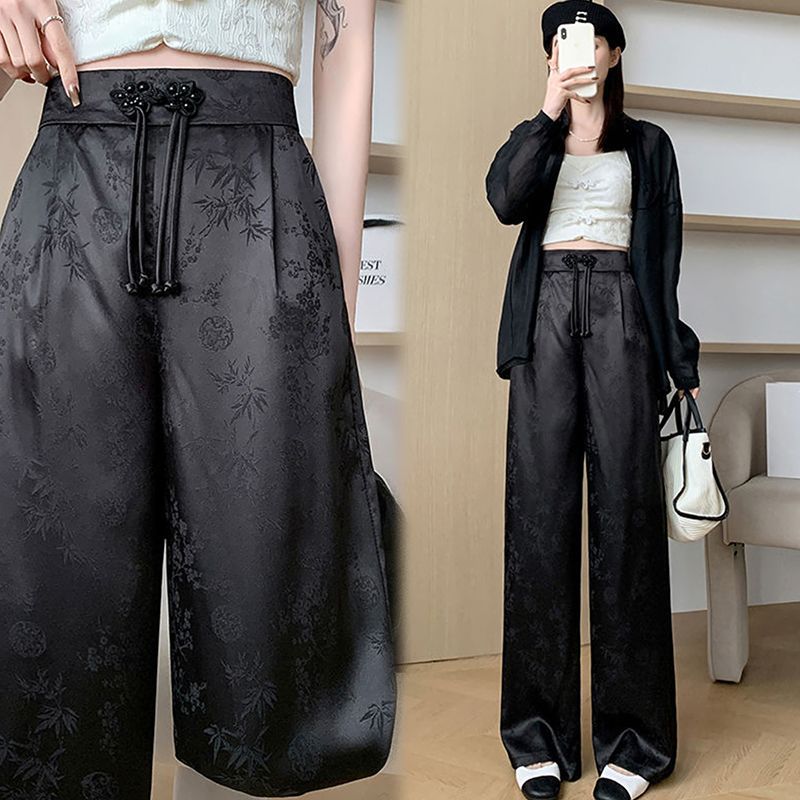 Celana kasual satin gesper jacquard gaya Tiongkok baru celana pel celana kaki lebar lurus longgar pinggang tinggi gaya nasional musim semi dan musim panas wanita