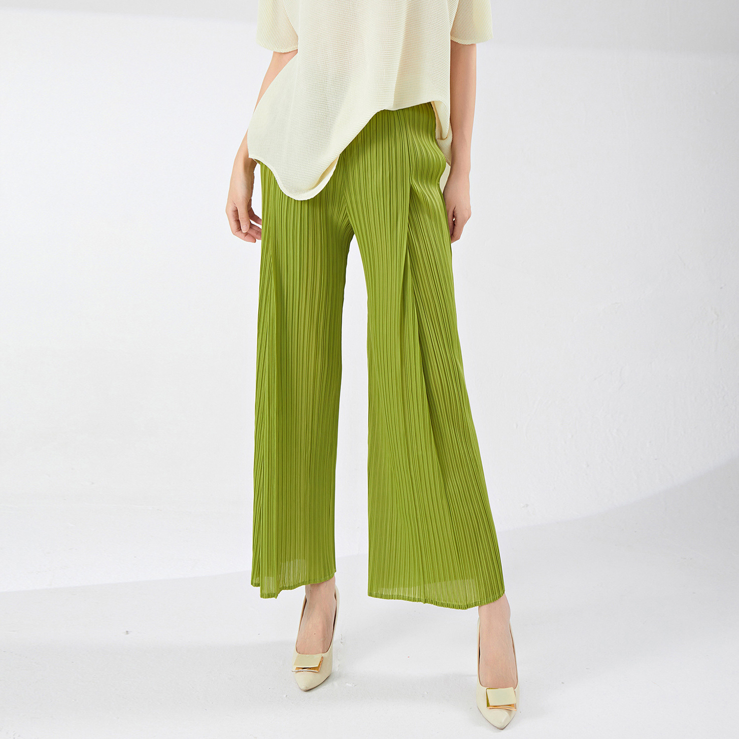 Celana lipit pelangsing wanita musim panas kelas atas, celana kasual serbaguna longgar dengan potongan lurus dan lebar bergaya Miyake.
