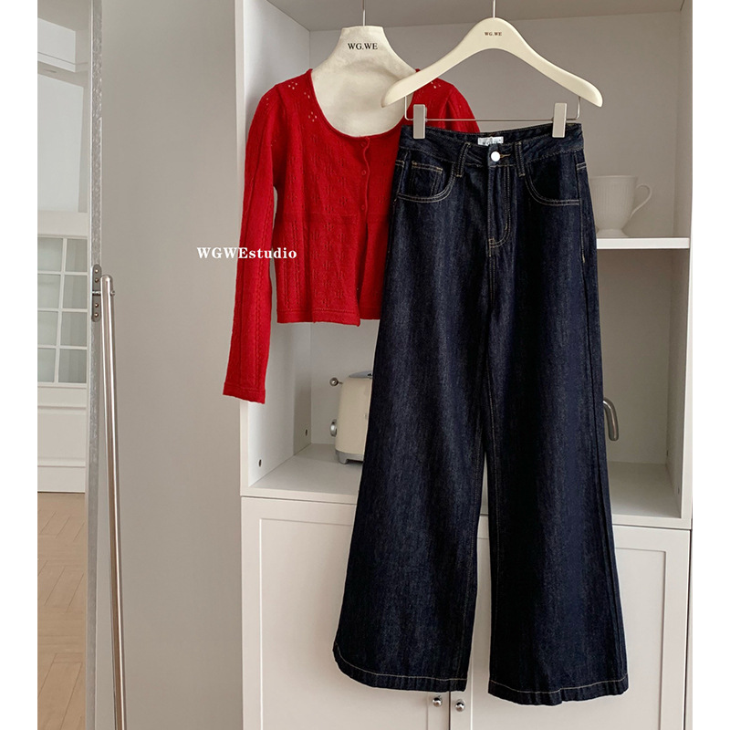 WGWE9757深蓝阔腿牛仔裤女休闲裤夏百搭薄款显瘦宽松直筒长裤