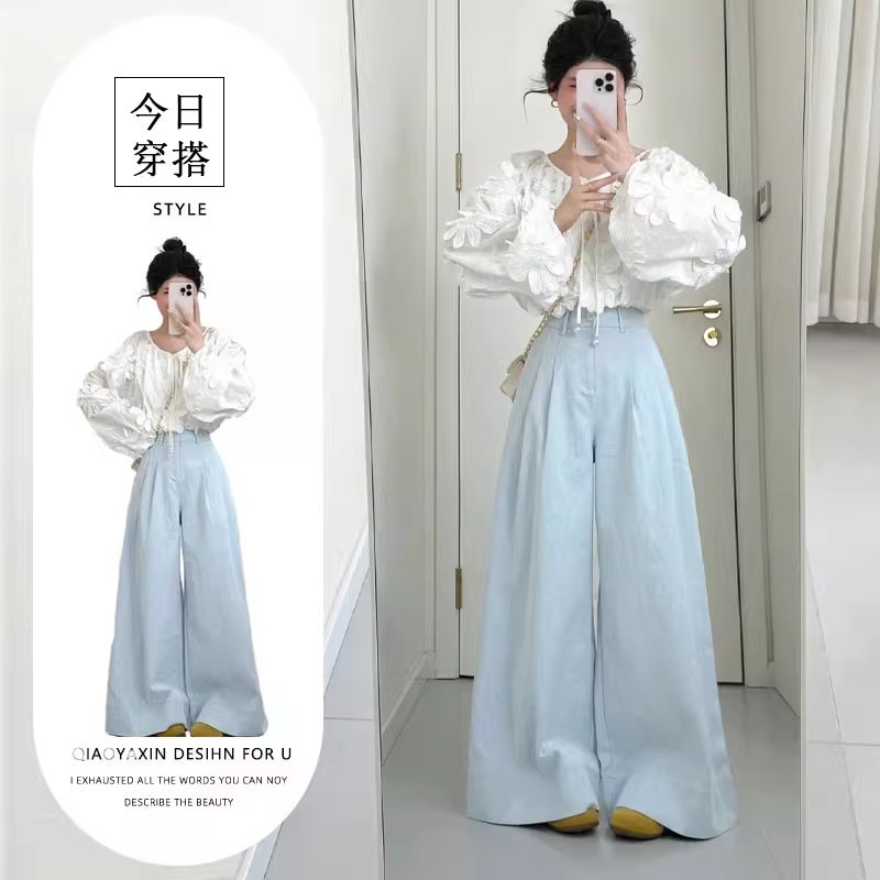 Single/2025 Musim Semi Model Baru Ukuran Besar Gadis Gemuk Tiga Dimensi Bunga Desain Kemeja Atasan Celana Kasual Pinggang Tinggi Wanita