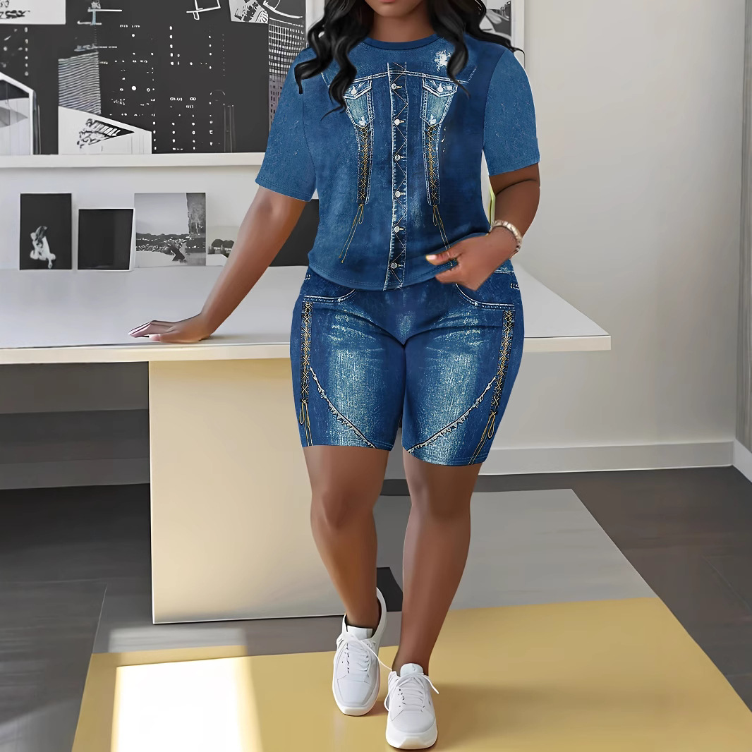 Pakaian Wanita Ukuran Besar Seluruh Tubuh Denim Cetak Set Dua Potong Lengan Pendek Kerah Bulat Longgar Atasan dan Celana Pendek Ketat