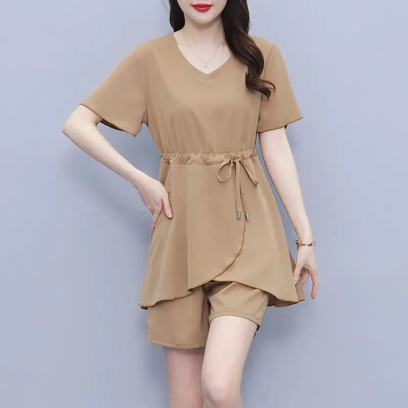 Pakaian Musim Panas Atasan Lengan Pendek Gaya Barat Setelan Ibu Longgar Ukuran Besar Celana Pendek Lengan Pendek Menutupi Perut Usia Setelan Dua Potong Wanita