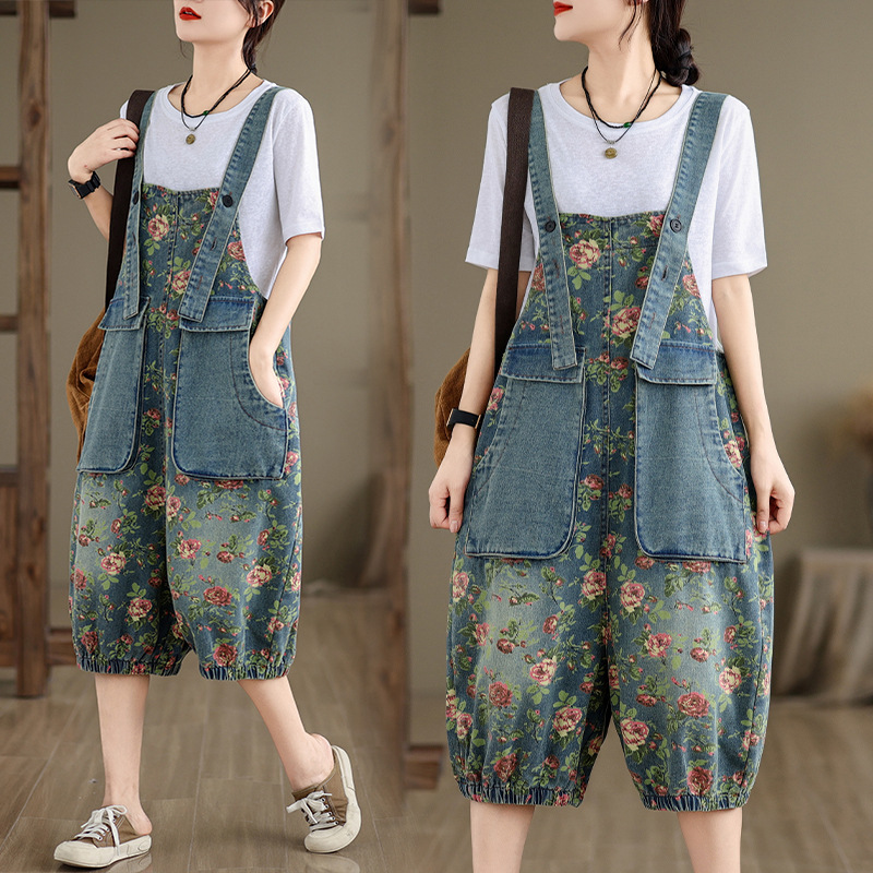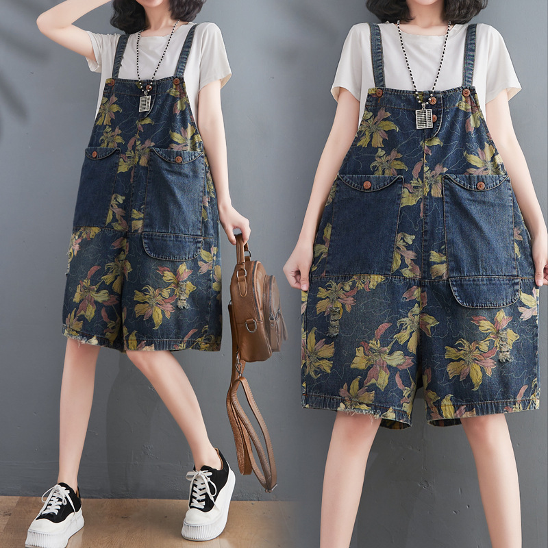 实拍复古文艺破洞印花夏季短款牛仔背带裤宽松大码百搭吊带裤