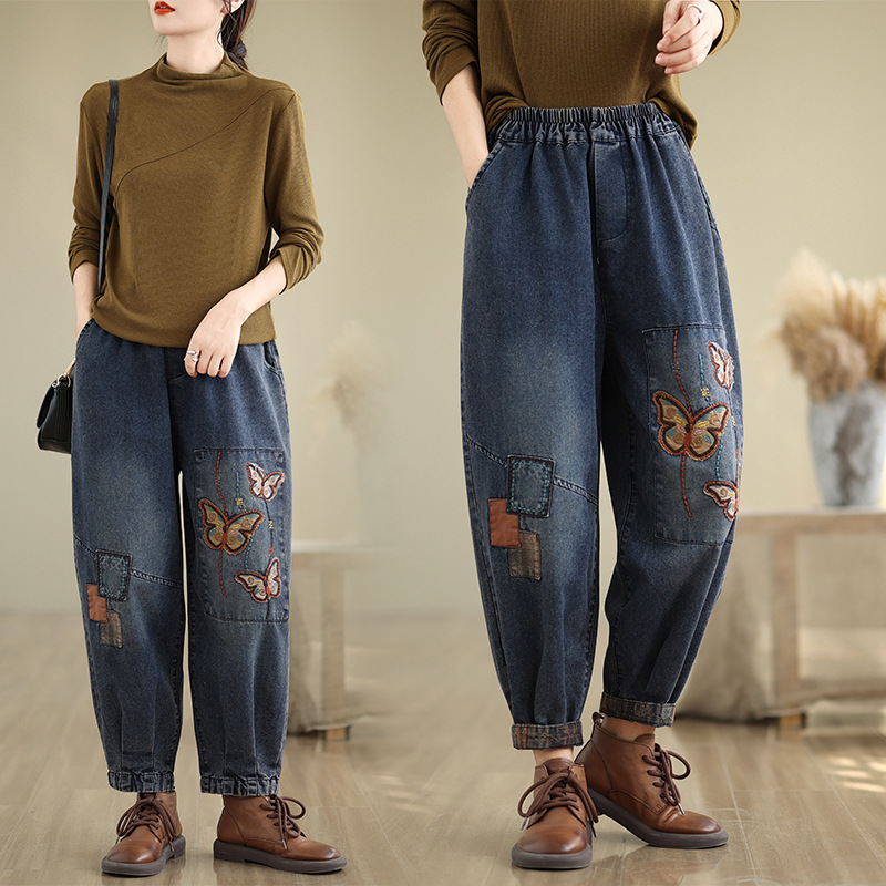 实拍现货秋冬文艺大码百搭蝴蝶刺绣牛仔裤简约宽松型九分裤