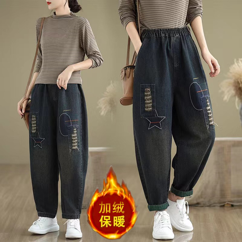 实拍 冬季加绒加厚大码宽松休闲时尚文艺百搭绣花哈伦老爹牛仔裤