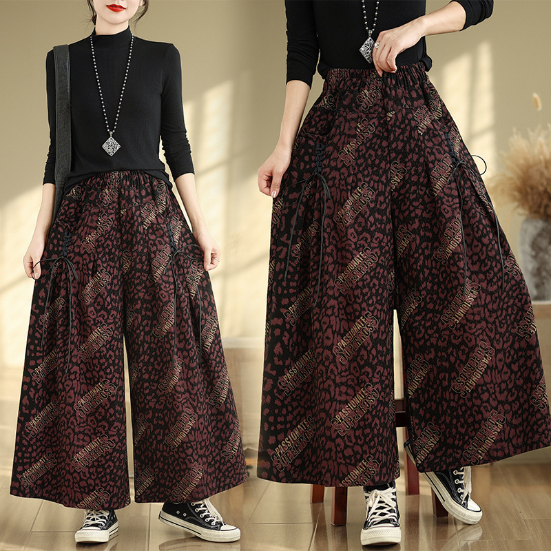 实拍大码牛仔阔腿裤新款豹纹时尚松紧宽松显瘦休闲百搭直筒阔腿裤