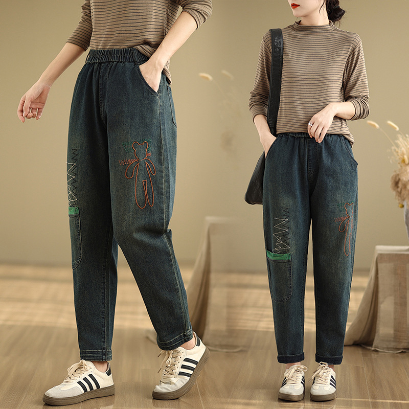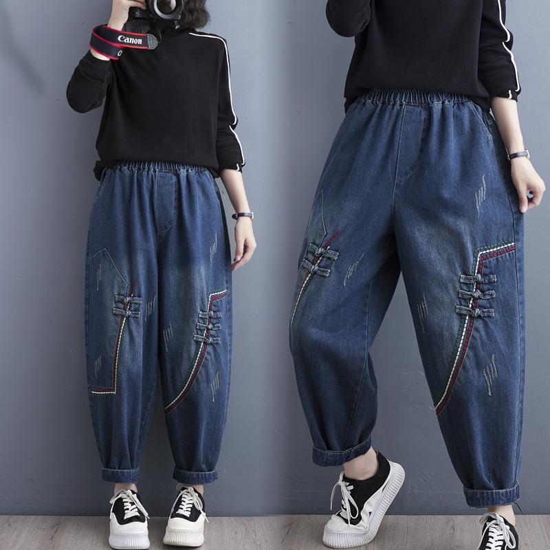 实拍 秋季新款文艺大码宽松牛仔裤松紧系带腰显瘦刺绣哈伦裤女