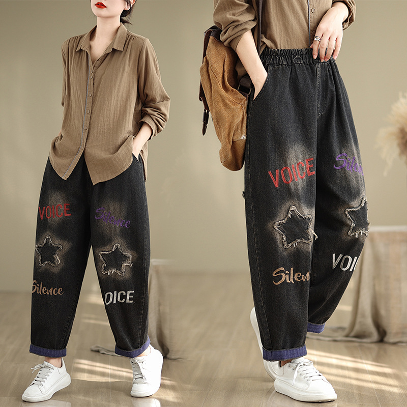 实拍 现货春秋款大码宽松休闲时尚文艺百搭绣花哈伦老爹牛仔裤