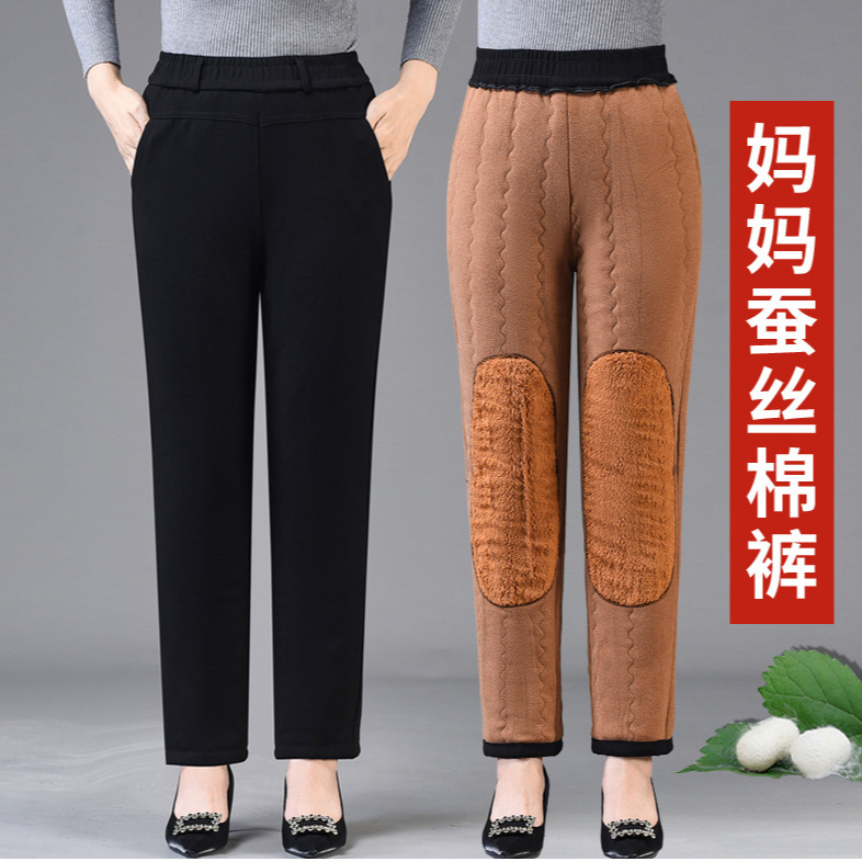 Celana katun ibu, celana wanita ukuran besar, berlapis bulu dan tebal, pelindung lutut, cocok untuk wanita paruh baya dan lanjut usia, gaya nenek, cocok untuk dipakai di luar ruangan, celana lurus, celana musim gugur dan musim dingin, potongan longgar.