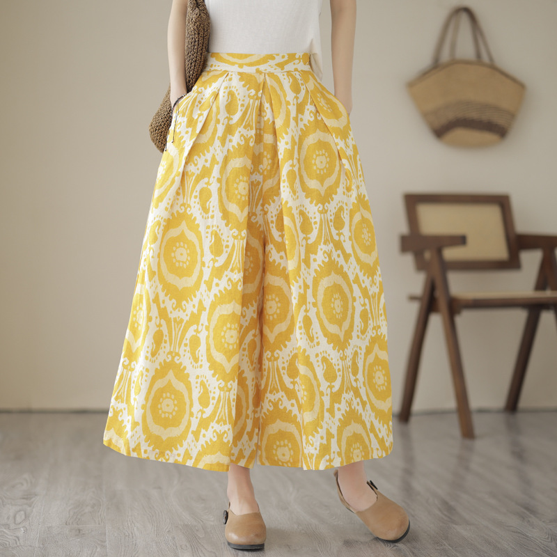Real shot celana kaki lebar wanita katun dan linen longgar artistik ukuran plus celana crop pinggang elastis gambar kuning kasual kulot musim panas