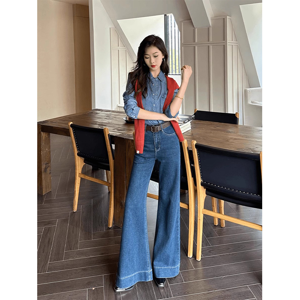 Celana Jeans Terompet Besar Warna Biru Tua Retro Gaya Hong Kong Celana Panjang Kaki Lebar Tergelat Pinggang Tinggi Musim Semi Musim Gugur 2024 Wanita