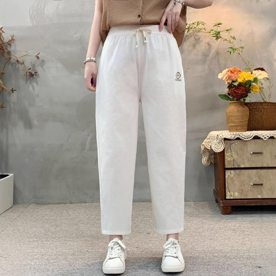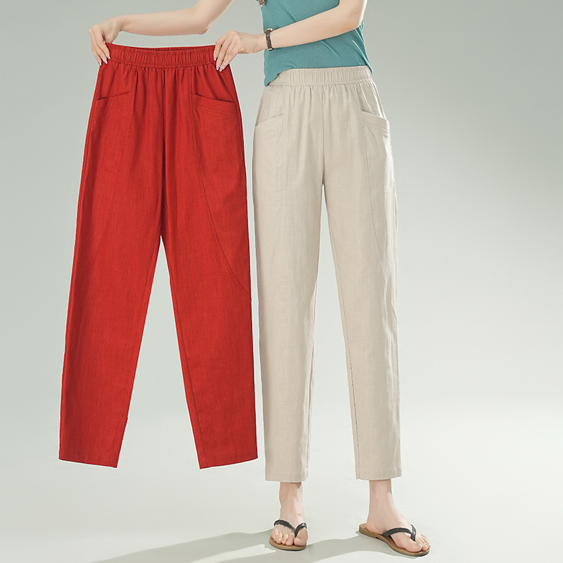 Celana katun linen wanita harem lobak ukuran besar longgar pinggang tinggi dipotong linen 2024 musim semi dan musim panas celana kasual lurus tipis