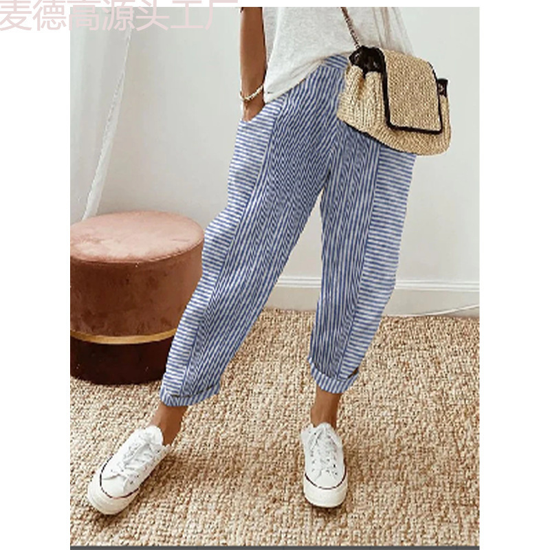 Celana crop katun dan linen Eropa dan Amerika 2023 celana panjang kaki bergaris katun dan linen longgar pinggang elastis renda lebar kompleks untuk wanita