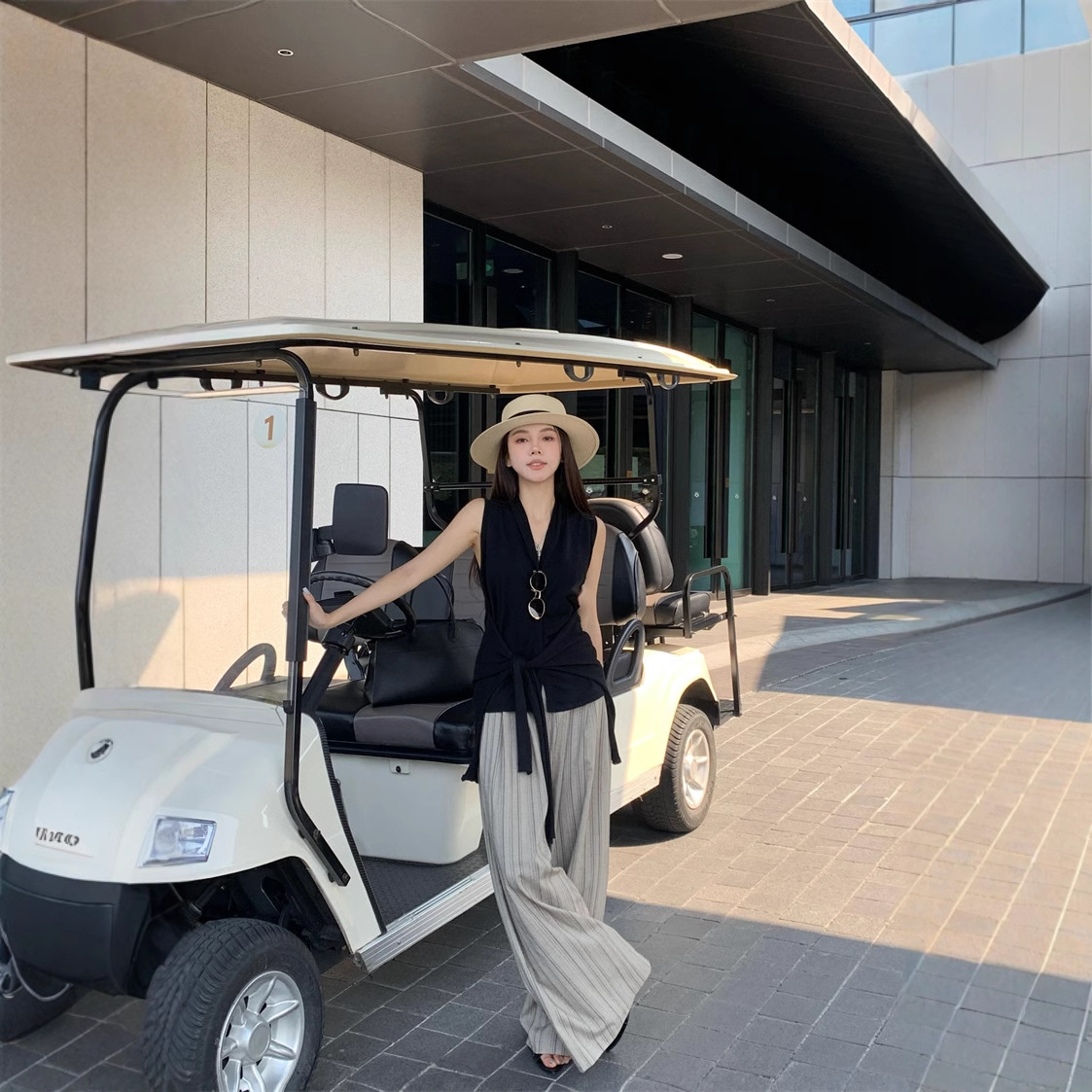 Tembakan nyata ~ Baju Rajutan Model Tipis Warna Hitam Celana Kasual Longgar Kaki Lebar Bergaris Pakaian Wanita Gaya Korea Model Baru Tahun 2025