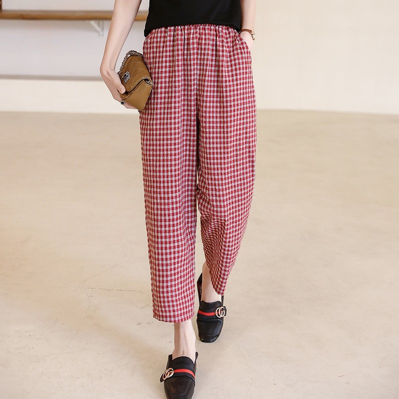 Celana 9/10 Katun Linen Kotak-kotak Celana Harem Kaki Kecil Terlihat Langsing Pakaian Wanita Setengah Baya Musim Panas Celana Pot Lentera Ukuran Besar Longgar Model Tipis