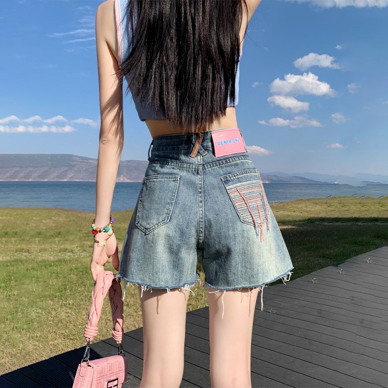 Celana pendek Denim kasual a-line pinggang tinggi celana panjang menengah tipis musim panas wanita celana pendek kaki lebar lurus longgar gadis gemuk ukuran besar