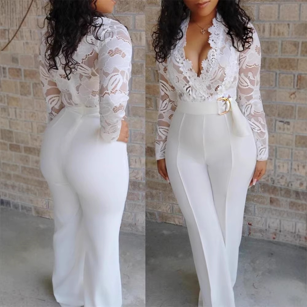 Ebay2019 Eropa dan Amerika musim gugur baru seksi deep V perspektif renda jahitan jumpsuit celana grosir wanita