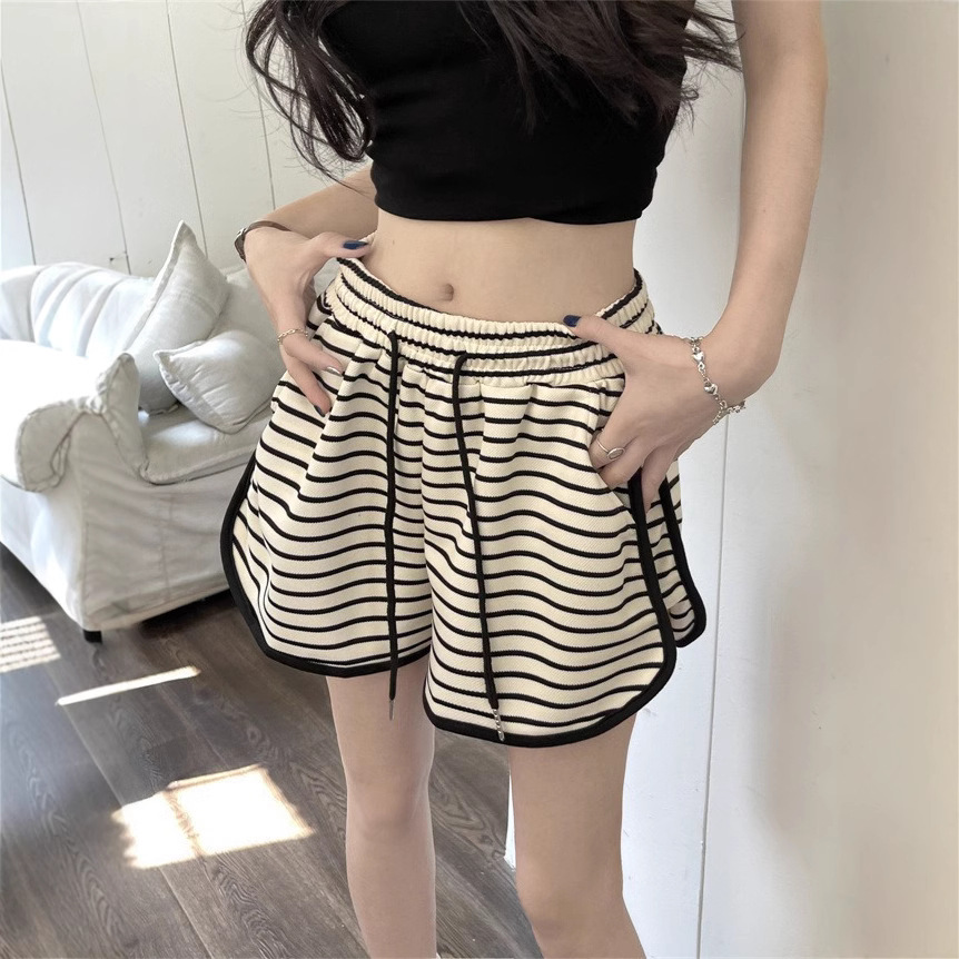 Celana Pendek Olahraga Bergaris Ukuran Besar Celana Panas Wanita Trendi Kaki Lebar Tiga Poin Santai Gadis Gemuk Terlihat Langsing Longgar Pinggang Tinggi Model Baru Musim Panas