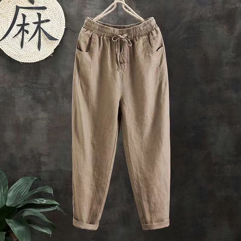 Celana katun dan linen baru musim panas untuk wanita 2026, celana wortel longgar artistik ukuran besar, celana harem retro serbaguna sembilan perempat untuk wanita.