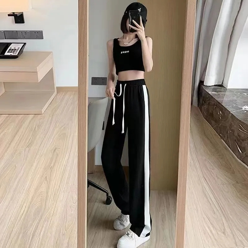 Celana wanita model tambal sulam pinggang tinggi, celana lebar kaki lebar, celana olahraga kasual musim panas ramping longgar