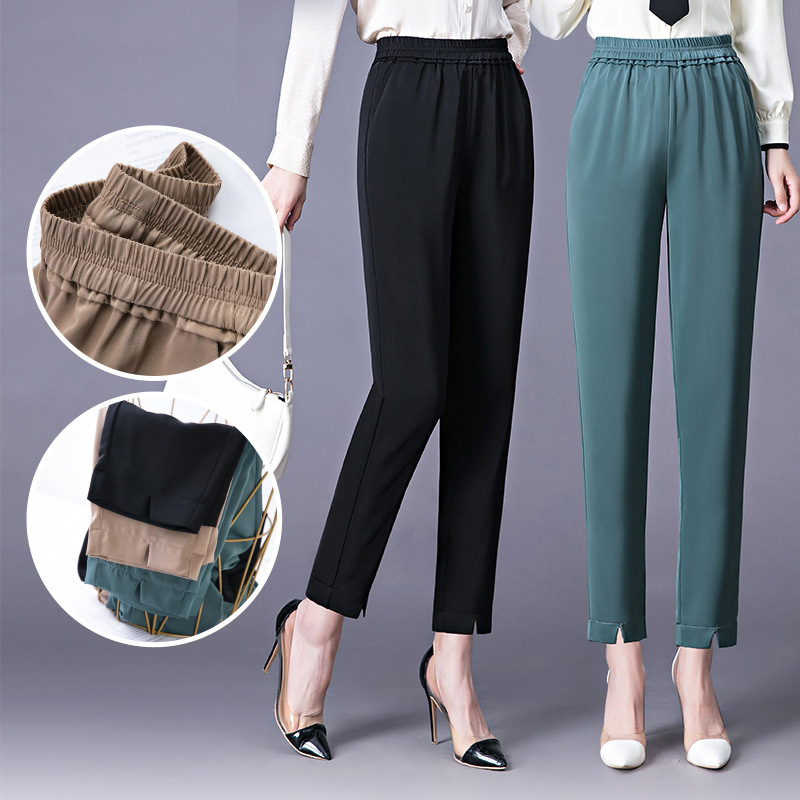 Celana ramping wanita, celana wanita kasual ibu longgar ukuran plus, celana melebar es sutra, tipis musim panas, celana keren