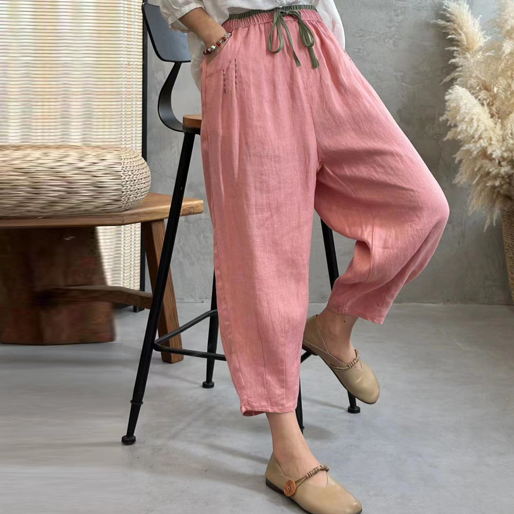 Celana wanita katun dan linen, celana wanita katun dan linen, celana kaki lebar gaya Korea, musim panas, warna solid, longgar, ukuran besar, Saku, celana lurus, pakaian luar, celana pelangsing kasual