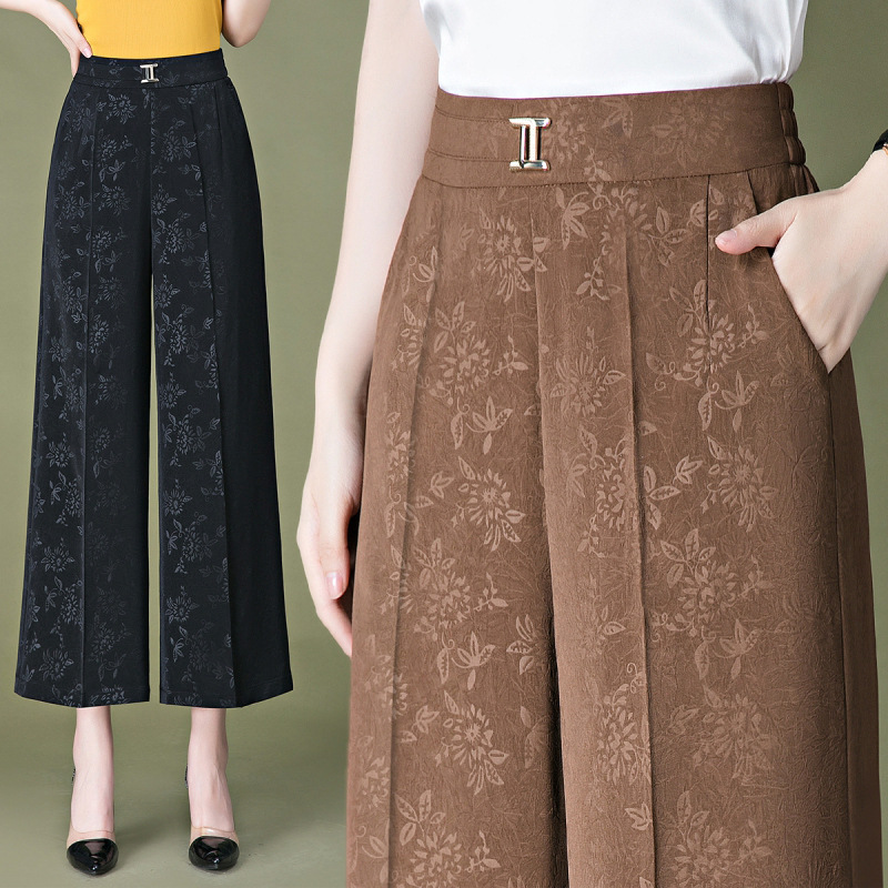 Celana kaki lebar crop Ice Silk wanita, Bawahan longgar kasual untuk ibu perempuan usia sedang, celana musim panas wanita ukuran plus