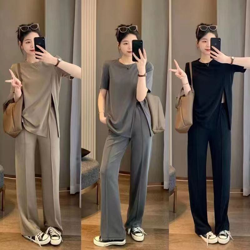 Setelan Celana Kaki Lebar Model Baru Wanita Atasan Lengan Pendek Gaya Desain Longgar Ukuran Besar Modis Versi Korea Musim Panas Celana Atasan Trendi