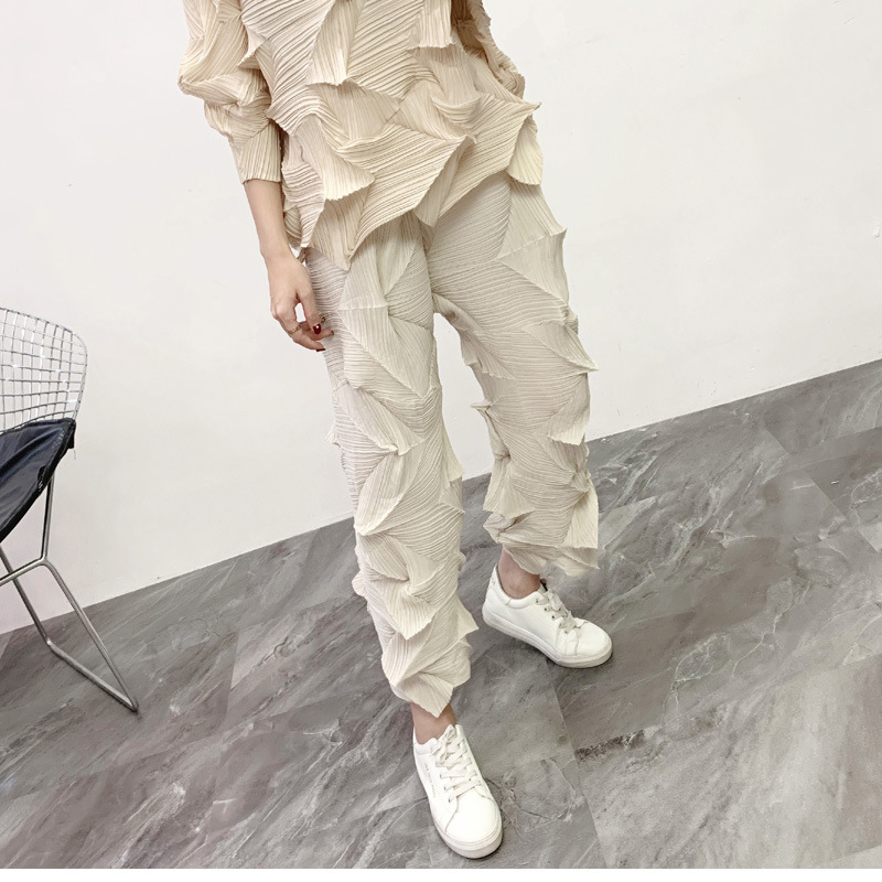 Celana lipat wanita, celana kasual hitam pinggang tinggi kaki lebar Miyaku ramping Harlan ukuran besar