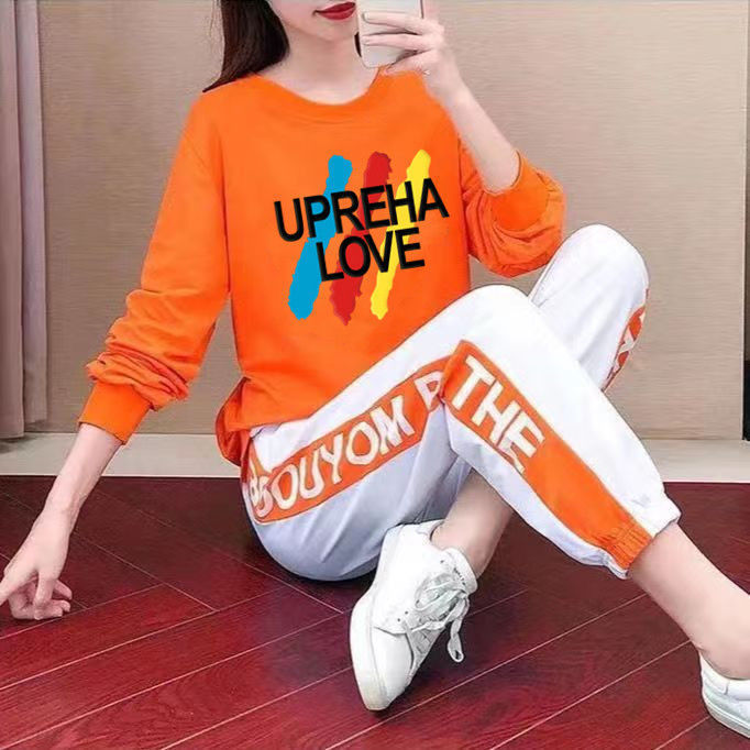 Setelan baju sweater wanita ukuran besar, baju sweater celana bibi merah kasual longgar gaya Korea Musim Semi dan Gugur
