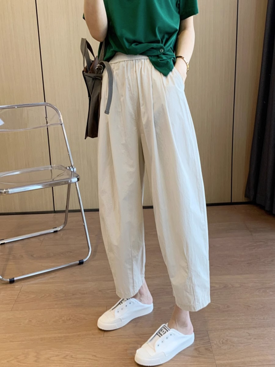 Musim semi dan musim gugur elegan pinggang elastis komuter Semua cocok gesper hitam sabuk pinggang sedang celana crop katun longgar celana wanita