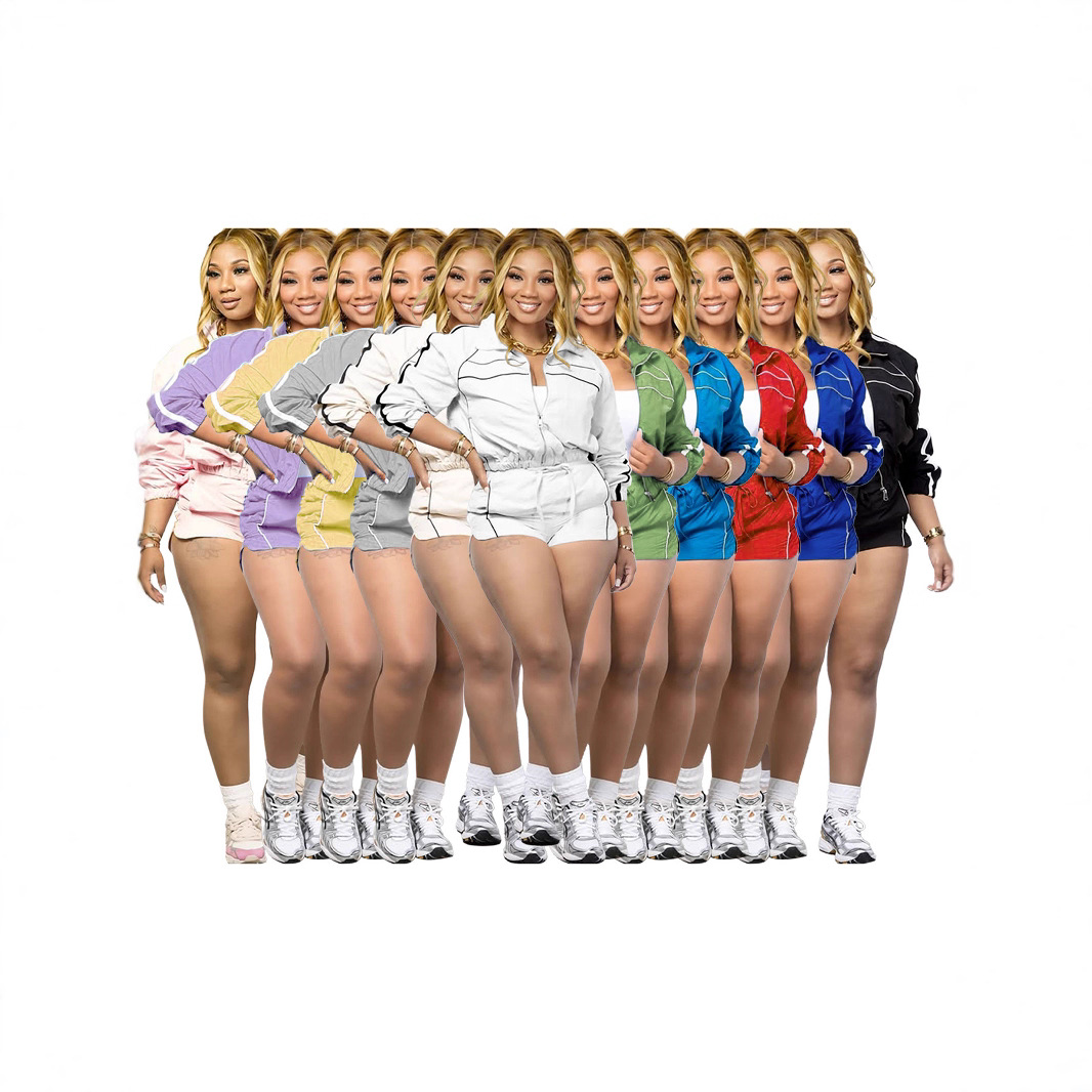 HR25020 Pakaian Wanita Eropa dan Amerika Seksi Gadis Pedas Lengan Panjang Ritsleting Warna Kontras Celana Pendek Tenunan Setelan Dua Potong Wanita