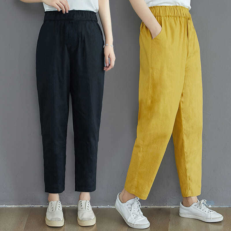 Celana kasual katun dan linen baru musim semi dan musim panas celana harem warna polos artistik longgar ukuran plus celana crop katun lembut