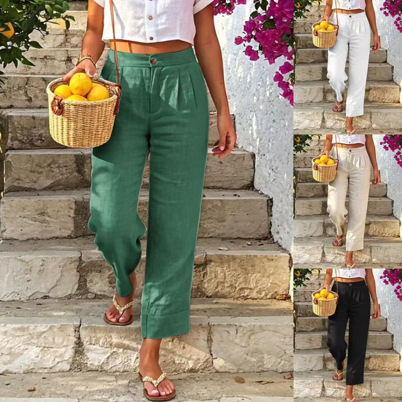 Celana Panjang Kaki Katun Wanita Celana Sembilan Persepuluh Longgar Pinggang Tinggi Ukuran Besar Katun Linen Model Baru Musim Panas 2025 Celana Lurus Kasual Wanita