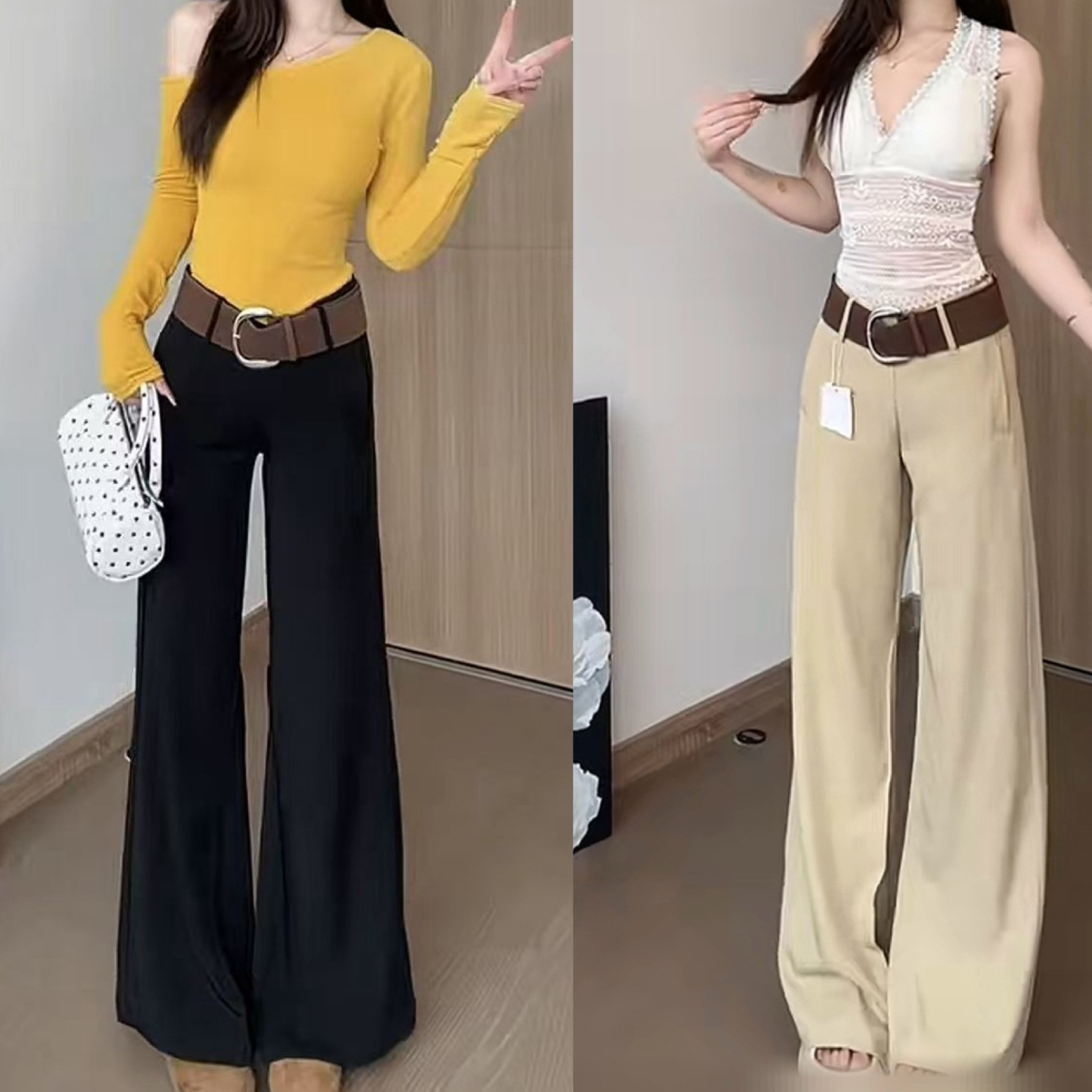 Celana panjang wanita model wide-leg musim semi dan panas 2025 warna hitam ukuran besar pinggang tinggi efek melangsingkan kasual longgar lurus