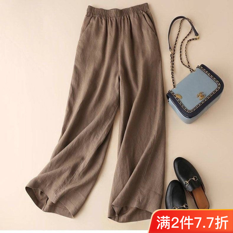 Celana crop katun dan linen wanita, bawahan panjang sedang bernapas kasual longgar ukuran plus Musim Panas 2022