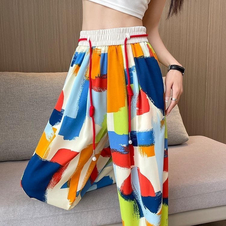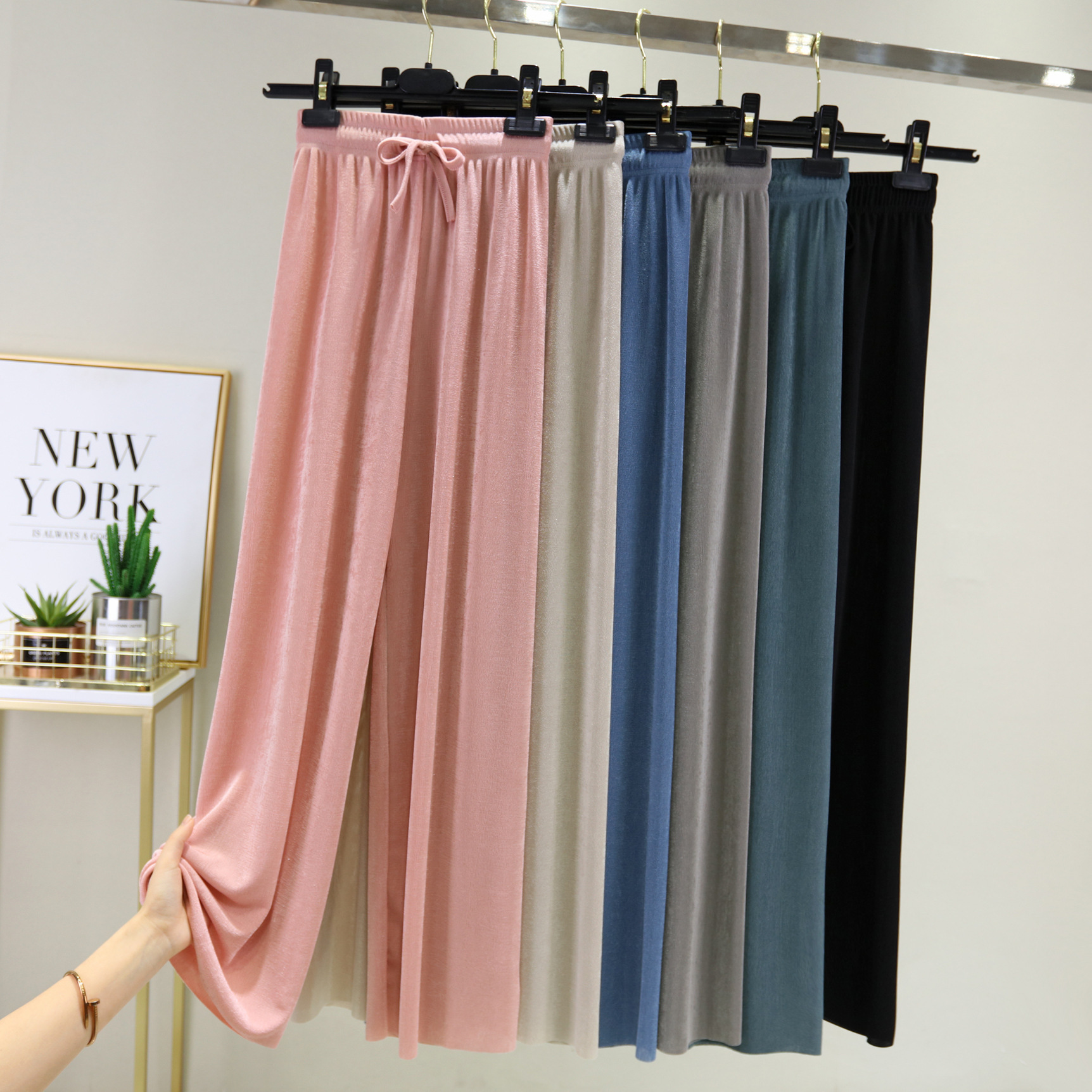 Celana kaki lebar ekstra besar untuk wanita, celana kasual lurus longgar ikat celup pinggang tinggi tipis musim panas, celana kaki lebar sutra es ukuran ekstra besar untuk anak perempuan