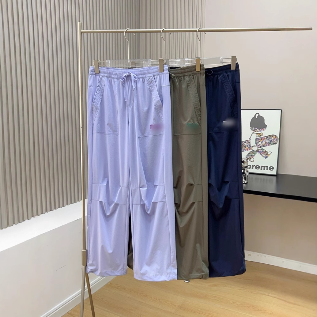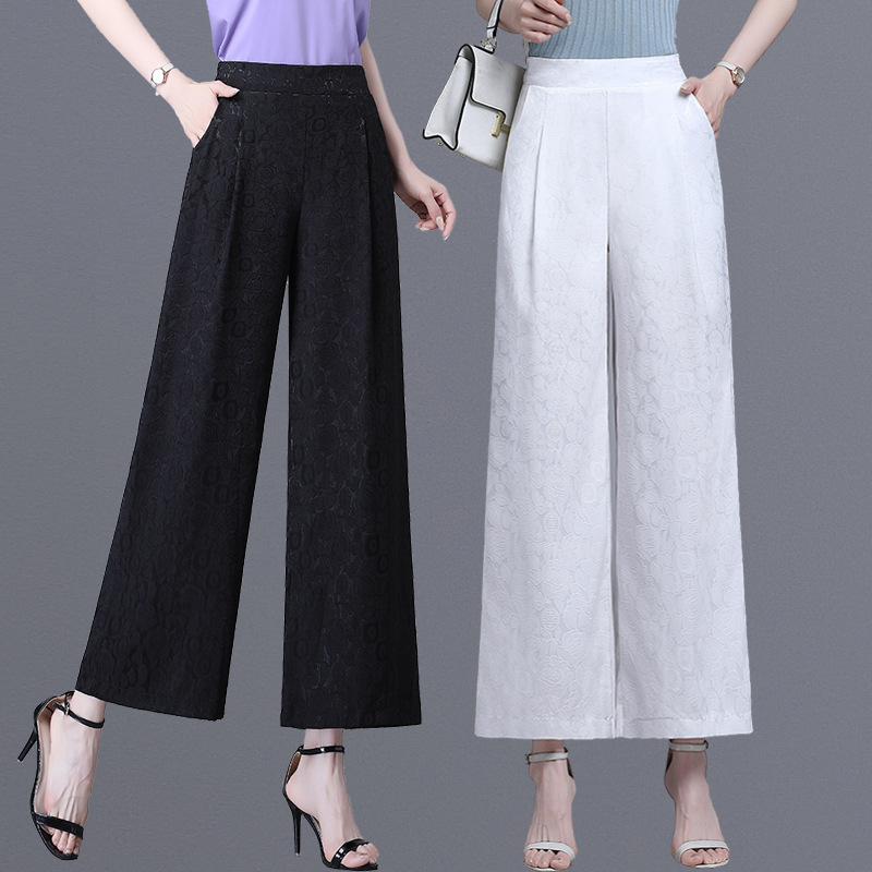 [Kapas Berkerut] Celana Kerja Kaki Lebar Tepi Renda Wanita Musim Panas Model Tipis Longgar Pinggang Tinggi Garis Kasual Lurus Olahraga