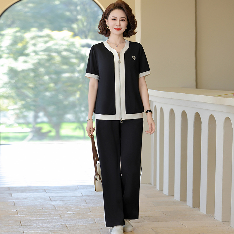 Setelan Musim Panas Ibu Ukuran Besar Gaya Barat Kardigan Lengan Pendek Menutupi Perut Atasan Celana Lurus Pakaian Wanita Setengah Baya dan Tua Setelan Dua Potong