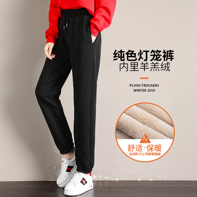 Celana panjang olahraga berlapis bulu pelajar musim dingin celana katun hangat dipertebal wanita celana lampion longgar lampu-terikat pergelangan kaki ukuran plus