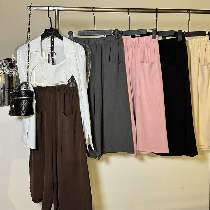 Celana 7/8 Musim Panas Wanita Celana Kasual Lipit Model Baru Versi Korea Terlihat Ramping Kerut Sutra Es Mudah Dipadu Padan Rok Rok Kaki Lebar Gaya Menggantung Pinggang Tinggi