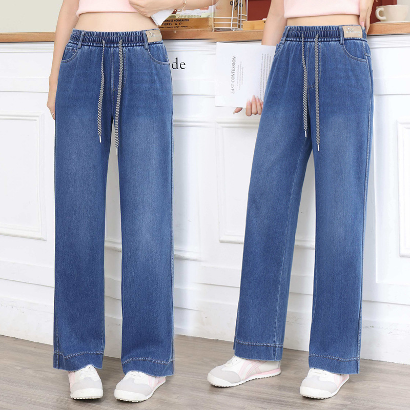 Celana Jeans Pinggang Elastis Longgar Ukuran Besar Celana Kaki Lebar Model Tipis Wanita Celana Lurus Pinggang Lebar Pinggang Lebar Pinggang Lebar Model Tipis Wanita Musim Panas 2025