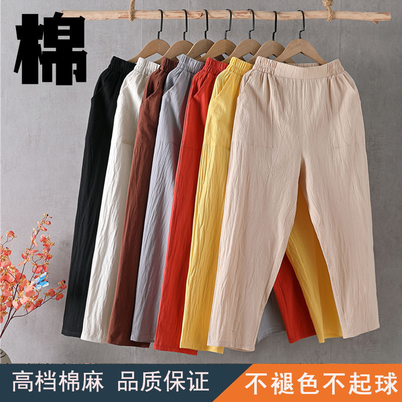Celana Kasual Wanita Katun Linen Celana Kaki Lebar Ukuran Besar Gaya Artistik Model Baru Musim Panas 2024 Celana 7/8 Wanita Terlihat Langsing Pinggang Tinggi